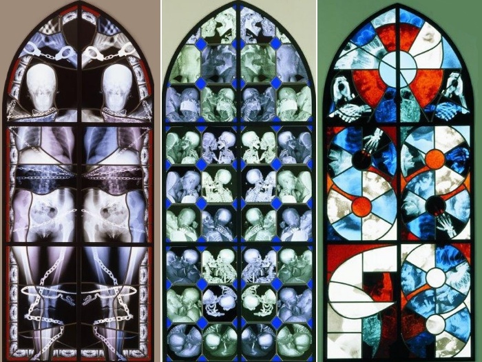 O cara usa radiografias de seres humanos para criar vitrais sinistros.